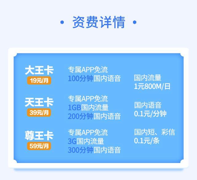电信王卡也是分为三大档,有大王卡、天王卡、尊王卡三种,重点给大家介绍一下大王卡。大王卡19元/月,内含100分钟全国语音,阿里大文娱系、百度系、网易系、今日头条系等多款APP定向免流。来电显示、189邮箱、全国接听免费。套餐外国内流量1元800M,不用不收费,超出自动叠加;国内语音0.1元/分钟,0.1元/条短信。